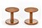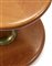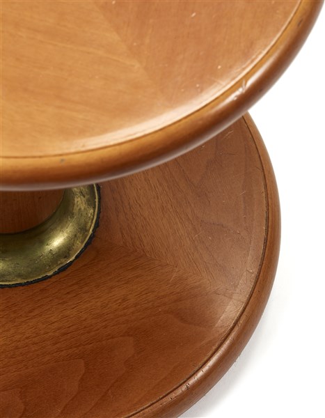 Lotto di due tavolini, variante del modello "Rocchetto". Produzione Linea Tre, Arcisate, 1999ca. Legno, ottone e lamina di metallo. Eseguiti per la sala d'attesa vip Alitalia dell'aeroporto di Linate. (h cm 41,5; d cm 41) (lievi difetti)
