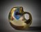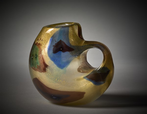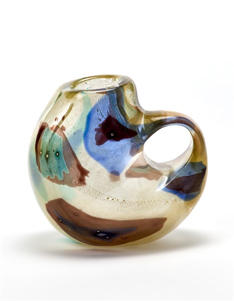 Vaso ad ansa in vetro soffiato cristallo a macchie ametista, verdi, blu e oro. Murano, 1952ca. (h cm 16)