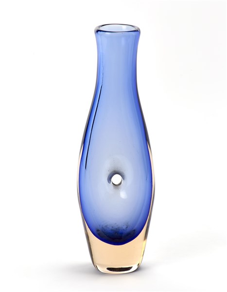 Vase from the "Forati" or "Buchi" series. Venini, Murano, 1951ca. Shape corresponding to drawing 4516 of the furnace catalog. Blown glass composed of blue and carnelian. One hole body and flattened section. Signed in acid under the base "venini murano". (h 29.5 cm.)