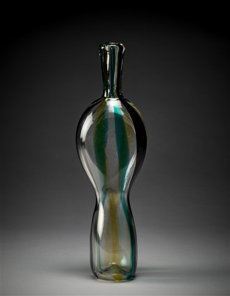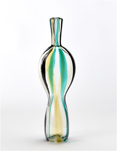 Grande vaso a bottiglia modello "4404". Venini, 1951. Vetro soffiato con fasce verticali applicate nella combinazione di colori "America", cristallo, ametista scuro, verde e pagliesco. Corpo a clessidra con sezioni schiacciate ruotate rispettivamente di 90°. Firmata all’acido "venini murano ITALIA" sotto la base. (h cm 43) (difetti)