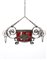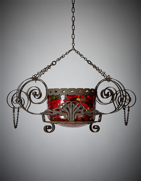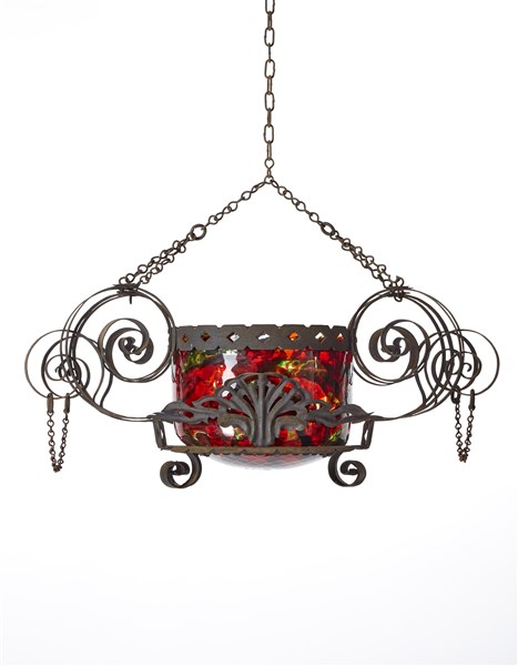 Cesendello in ferro battuto e lamina di ferro sbalzata con grandi volute a riccioli intrecciati, fronti a foglie d'acanto. Includente un vaso a caldaia in vetro soffiato trasparente a filamenti verdi, rossi e ametista scuro su fondo incolore. Esecuzione Vetreria Artistica Barovier, Venezia/Murano, anni '20. (cm 60x105x36) (lievi difetti, restauro conservativo professionale)