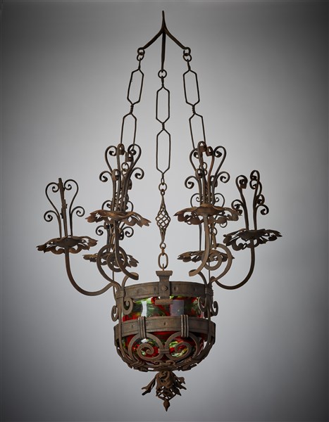 Six-light cesendello chandelier in wrought iron and embossed iron sheet, including a transparent blown glass boiler vase with green, red and amethyst filaments on a colorless background. Execution by Vetreria Artistica Barovier, Venice / Murano, 1920s. (h 125 cm.; d 74 cm.) (slight defects, small professional conservative restoration)