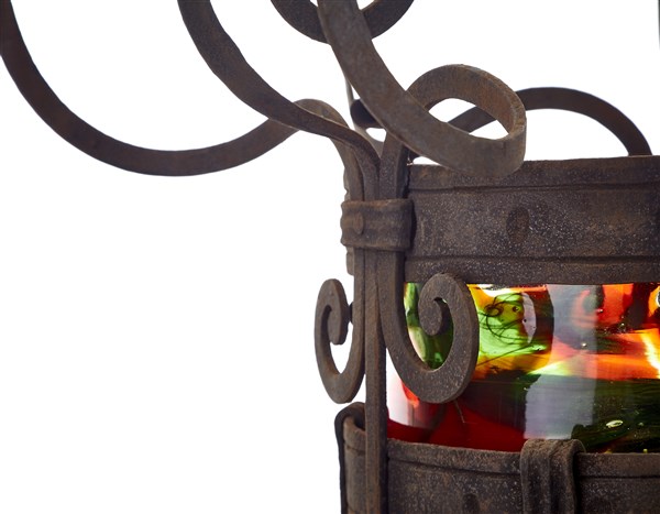 Lampadario a cesendello a sei luci in ferro battuto e lamina di ferro sbalzata, includente un vaso a caldaia in vetro soffiato trasparente a filamenti verdi, rossi e ametista su fondo incolore. Esecuzione Vetreria Artistica Barovier, Venezia/Murano, anni '20. (h cm 125; d cm 74) (lievi difetti, piccolo restauro conservativo professionale)