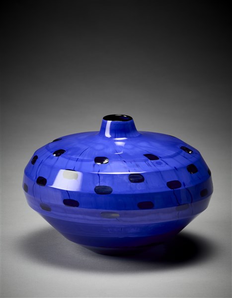 Disc vase of the series "Gocce di murrine". Execution by Livio Serena e Giacomo Barbini, Murano, 2000. Cobalt blue cane blown glass with crystal glass murrine, base part in transparent light blue glass, rim in opaque black glass. Ground and polished on the external surface. Single piece. Signed and dated under the base "Yoichi Ohira, m ° L. Serena, m ° G. Barbini, 1/1 unico, Friday 17.03.2000, Murano", monogram of the artist. (h 12 cm.)