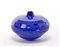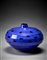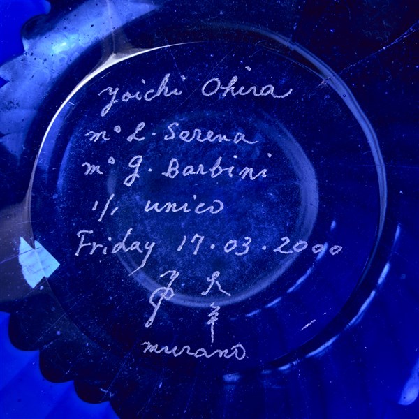Vaso a disco della serie "Gocce di murrine". Esecuzione Livio Serena e Giacomo Barbini, Murano, 2000. Vetro soffiato a canne blu cobalto con murrine in vetro cristallo, parte basamentale in vetro blu chiaro trasparente, orlo in vetro nero opaco. Molato e lucidato sulla superficie esterna. Pezzo unico. Firmato e datato a punta sotto la base "Yoichi Ohira, m° L. Serena, m° G. Barbini, 1/1 unico, Friday 17.03.2000, Murano", monogramma dell'artista. (h cm 12)
