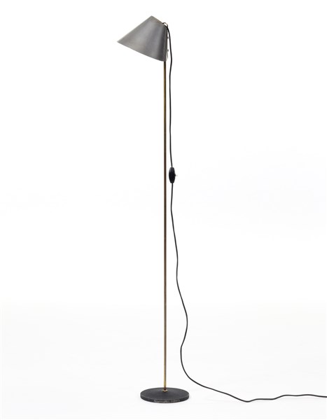 Lampada da terra modello "LTE4 Monachella". Produzione Azucena, Milano, 1953. Base in ghisa verniciata in nero, asta in ottone lucidato e paralume scorrevole in alluminio laccato grigio. (h cm 125) (lievi difetti)
