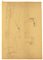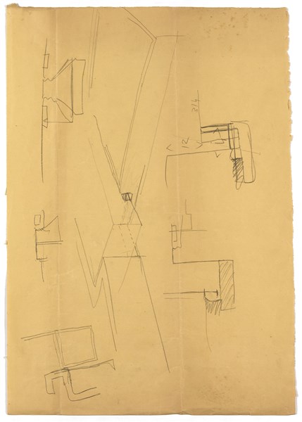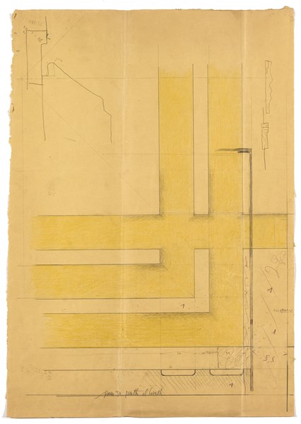 Foglio con al recto uno studio realizzato da Carlo Scarpa con un collaboratore per l'intarsio in pietra d'Istria con disposizione a quarto eccentrico intorno al logo Olivetti in rame con lampada incorporata nell'atrio principale, parete laterale; al verso alcuni studi delle relazioni tra la vasca in marmo nero del Belgio, il suo bordo di contenimento e la pavimentazione adiacente verso l'atrio. Venezia, S.D. [1957-58 ca]. Grafite e pastello giallo su carta. (cm 64x45,3)