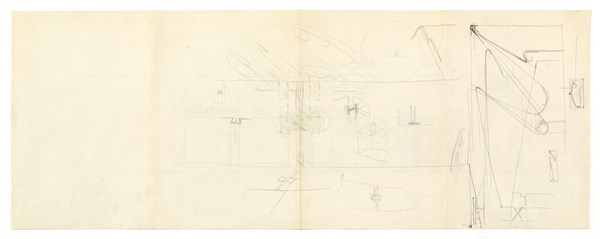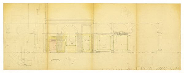 Sheet with heliocopy studies on the front for the side elevation, on the reverse studies for the cross section of the basin in black Belgian marble located in the atrium. Venice, S.D. [1957-58 ca]. Heliocopy; graphite, green, yellow and red pastel on paper. (41.5x109.6 cm.)