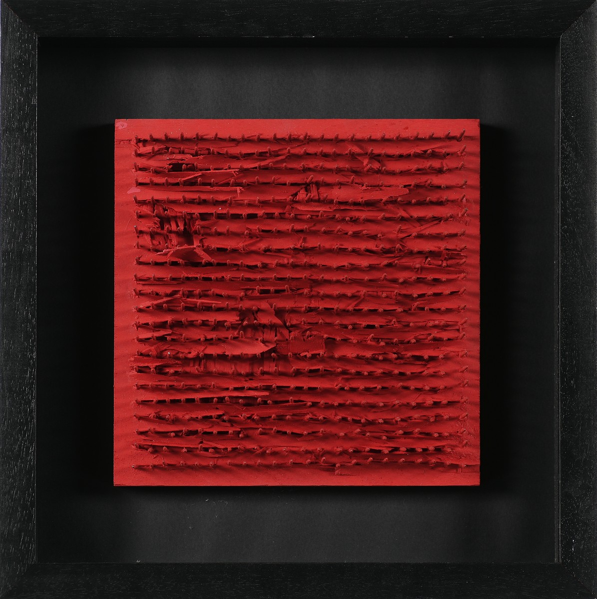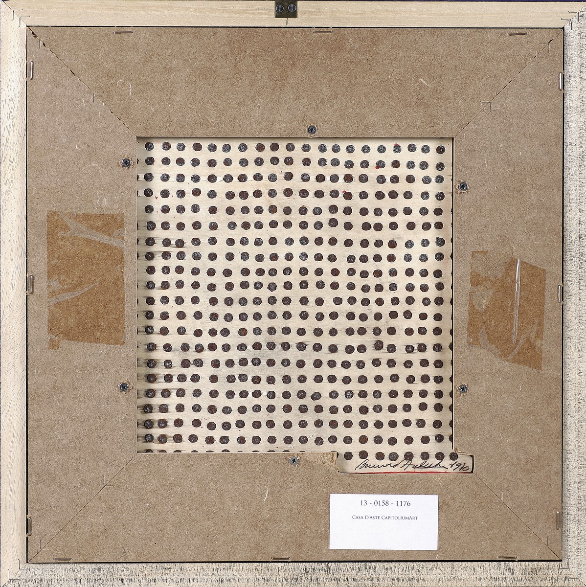 AUBERTIN BERNARD (n. 1934) Tableau clous. 1970. Chiodi su tavola. Cm 24,00 x 24,00. Firma in basso a destra. Opera archiviata presso l'Archivio generale delle opere di Bernard Aubertin come da documentazione fotografica allegata riportante il relativo numero d'archivio. Cornice presente