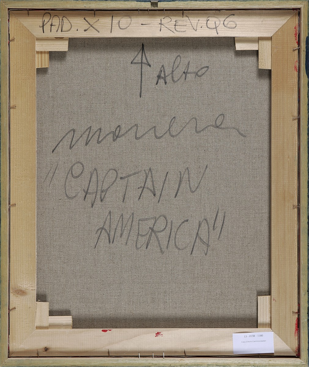 MANERA ENRICO (n. 1947) Capitan America. Acrilici su tela . Cm 50,00 x 60,00. Al retro firma e titolo. Autentica dell'artista su fotografia. Cornice presente