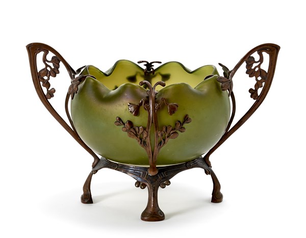 Coppa centrotavola in vetro verde con montatura in rame lavorato a motivi floreali. Austria, inizio secolo XX. (cm 37x25x26) (lievi difetti)