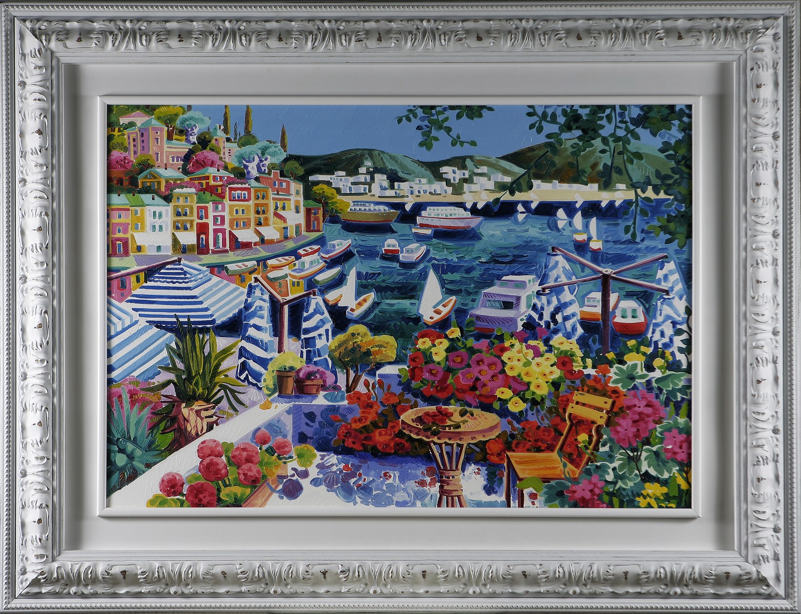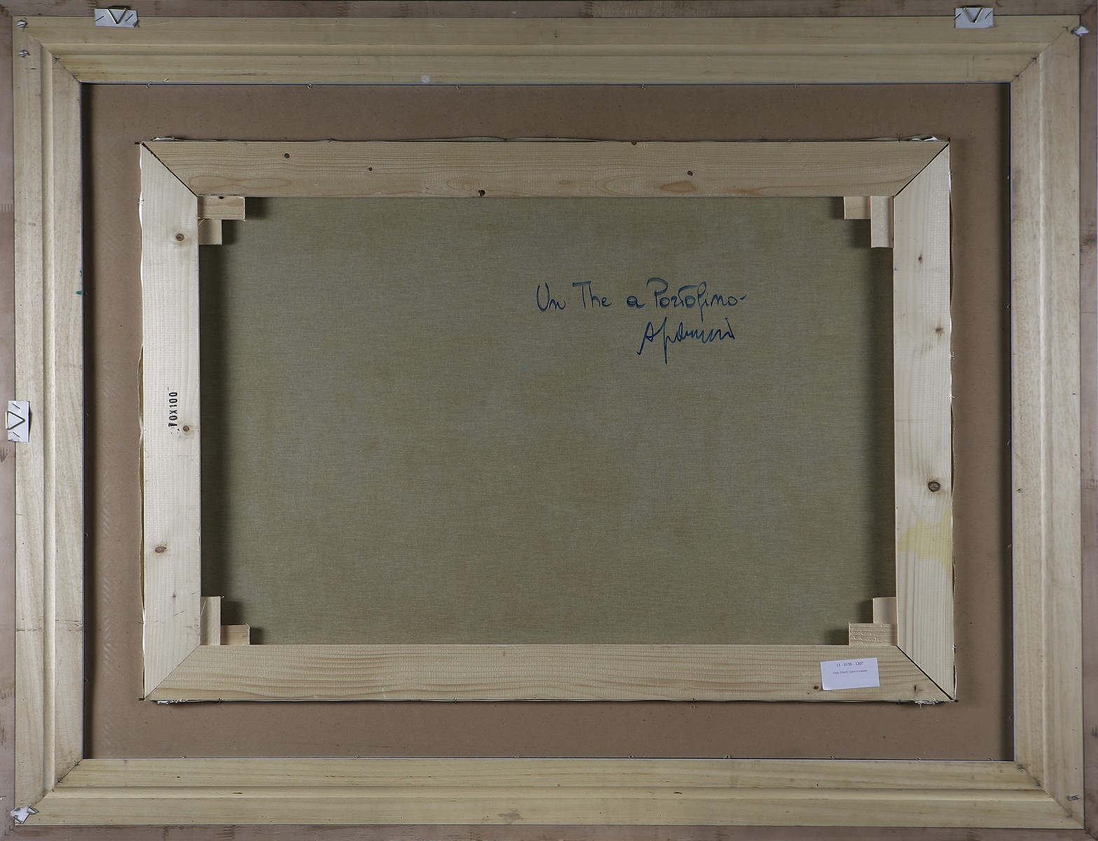 FACCINCANI ATHOS (n. 1951) Un the a Portofino. 2012. Olio su tela . Cm 100,00 x 70,00. Firma in basso a destra. Al retro firma e titolo. Autentica dell'artista su fotografia. Cornice presente
