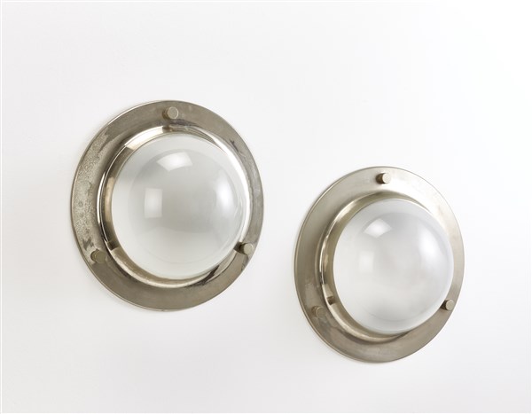 Coppia di plafoniere-appliques modello "LSP6 Tommy". Produzione Azucena, Milano, 1965. Struttura in acciaio lucidato, paralume in vetro smerigliato internamente. (d cm 35,5) (lievi difetti)