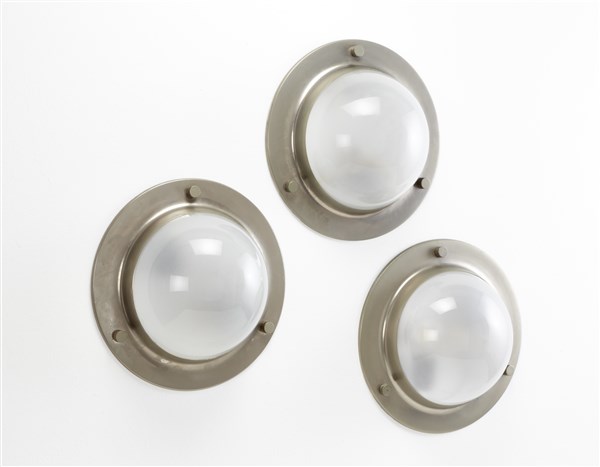Lotto di tre plafoniere-appliques modello "LSP6 Tommy". Produzione Azucena, Milano, 1965. Struttura in acciaio lucidato, paralume in vetro smerigliato internamente. (d cm 35,5) (lievi difetti)