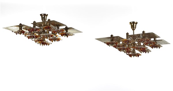 Two suspension lamps with brass structure and elements in colorless and pagliesco printed glass. Italy, 1970s. (68x68 cm.) (slight defects and small losses)