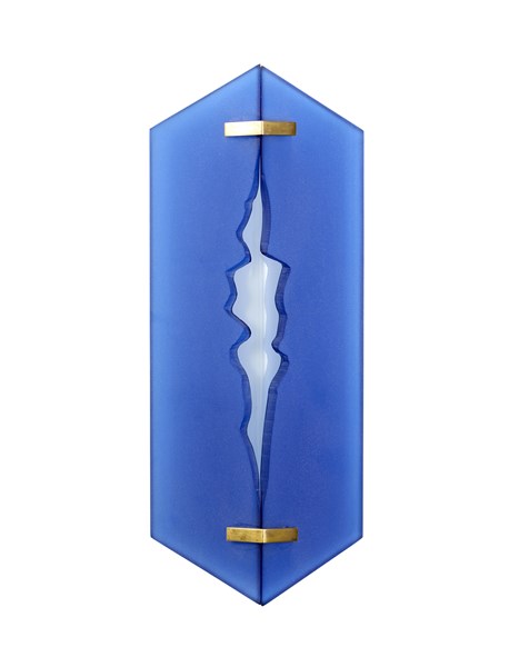 Lampada da parete. Produzione Fontana Arte, Milano, anni '60. Doppio paralume in cristallo di forte spessore molato e satinato blu e metacrilato opalino, struttura in metallo verniciato bianco, fermavetri in metallo ottonato. (l cm 46) (lievi difetti)