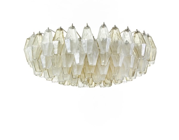 Lampada a sospensione a poliedri. Venini, Murano, 1958ca. Vetro soffiato in stampo trasparente incolore e pagliesco, struttura in metallo verniciato bianco. (d cm 65) (lievi difetti)