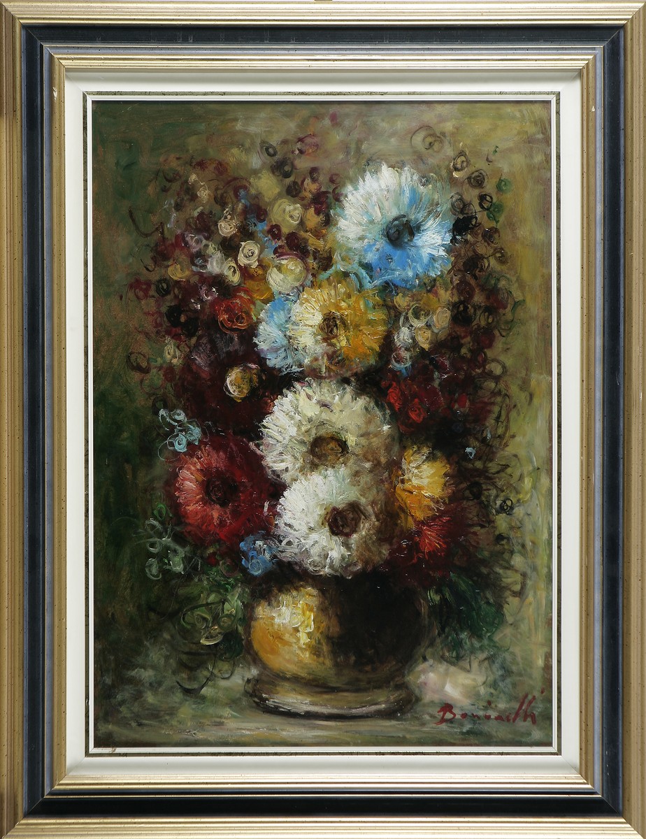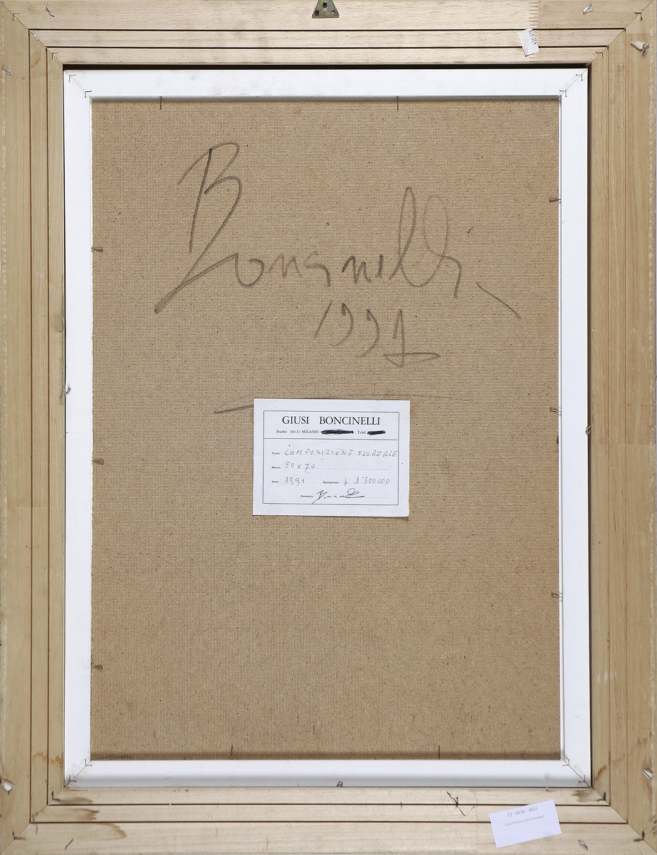 BONCINELLI GIUSI Composizione floreale. 1991. Olio su tavola. Cm 50,00 x 70,00. Firma in basso a destra. Al retro firma, data e cartiglio descrittivo dell'opera. Cornice presente