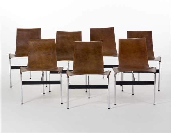 Lotto composto da sette sedie modello "T-Chair 4LC". Produzione De Padova per Laverne International, Italia, disegno del 1952, esemplari della metà degli anni '60. Struttura in acciaio e metallo smaltato, sedile e schienale in cuoio. (cm 60x83x60) (restauri)
