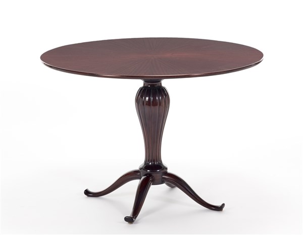 Tavolo in legno di mogano massello e bordato, gamba centrale a balaustro costolato su quattro gambe inflesse, piano impiallacciato con disegno stellare. Milano, 1940ca. (h cm 78; d cm 110) (lievi difetti)