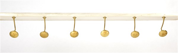 Appendiabiti da parete a sei pomoli in fusione di ottone, con grande mensola-cappelliera da incasso in marmo bianco venato. Milano, anni '40. (cm 173,5x35)