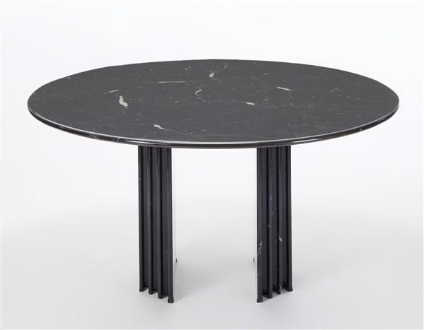 Table with base made of black veined marble slabs placed side by side on a metal substructure, circular top in black marble. Italy, 1960s/1970s. (h 72 cm.; d 150 cm.) (slight defects)