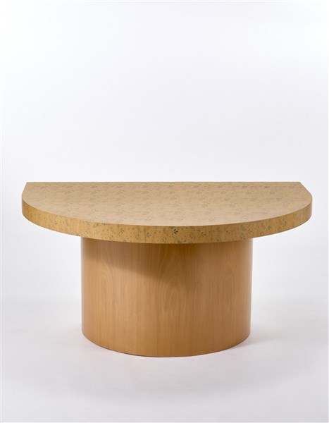 Tavolo modello "Albagia". Produzione Poltronova, Firenze, anni '70. Impiallacciato in legno chiaro e piano impiallacciato in legno decorato a stampa con motivi floreali verdi. (cm 147,5x72,5x103,5) (lievi difetti)