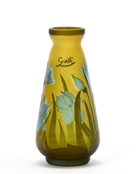 Cameo glass vase etched with acid in shades of amber and decorated with floral motif in shades of blue. Central Europe, 20th century. (h 22 cm.) (slight defects)