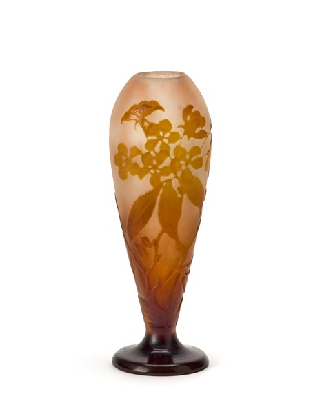 Gallé Vaso a corpo bulbiforme affusolato, in vetro a cammeo inciso all’acido con