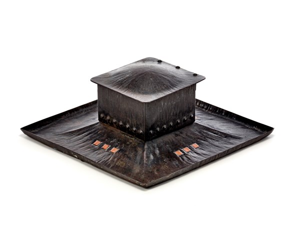 Calamaio di gusto Wiener Secession in lamina di ferro balzata e decorata con ri