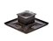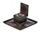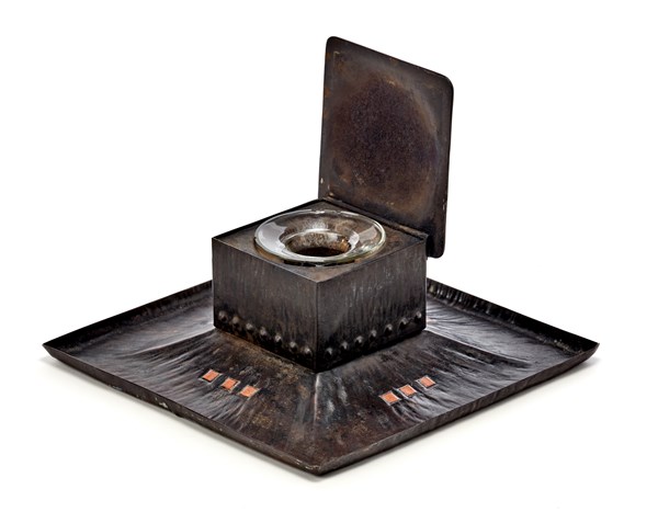 Inkwell of Wiener Secession style in embossed iron sheet and decorated with orange enamelled relief squares. Cut crystal ink container. Italy / Austria, 1900ca. (24x10x24 cm.) (defects)