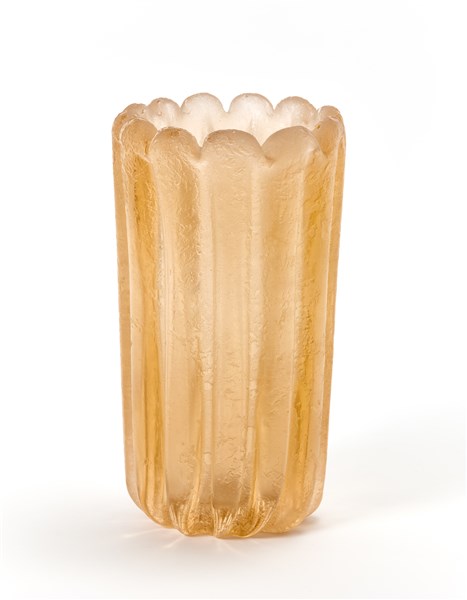 Vaso cilindrico in vetro soffiato rosa costolato e corroso. Murano, seconda metà secolo XX. Firmato a punta sotto la base. (h cm 22; d cm 12)