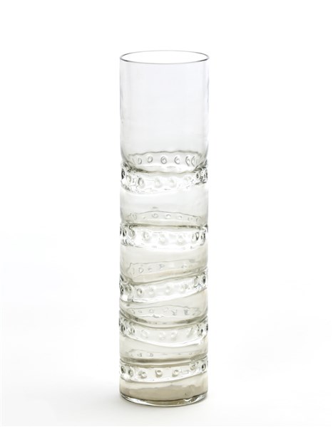 Vaso cilindrico in vetro fumè con fasce orizzontali decorate a motivi circolari a rilievo. Murano, 1968. Firmato, datato e dedicato a punta sotto la base "BIANCONI FULVIO E BRUNA 1968 ANNA E NINO". (h cm 28,5; d cm 7,5) (difetti)