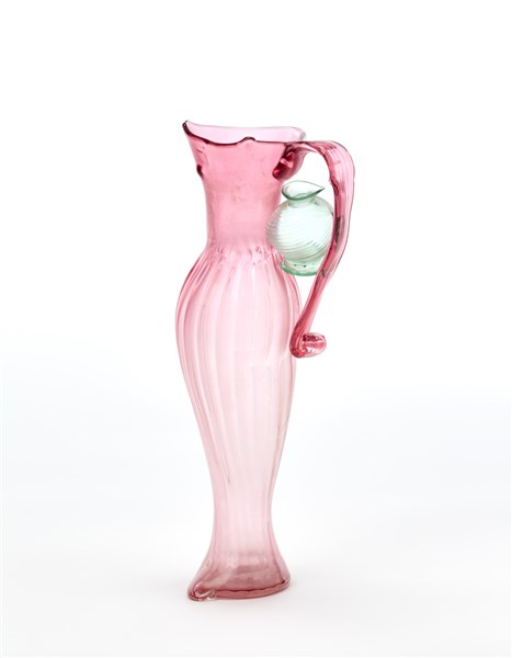 Vaso ad un'ansa con corpo costolato e bocca triangolare in vetro trasparente rosa. Elemento decorativo incluso all'interno dell'ansa in vetro trasparente verde. Murano, anni '60. Firmato a punta sotto la base. (h cm 35,5) (difetti)