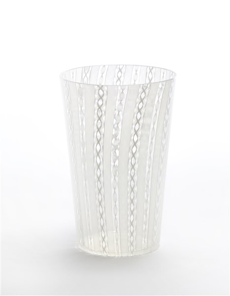 Vaso troncoconico in vetro soffiato a canne di zanfirico lattimo. Seconda metà secolo XX. (h cm 27; d cm 18,5)
