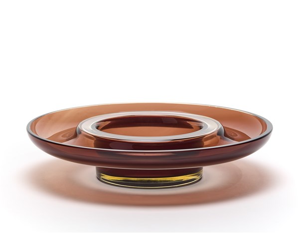 Centrotavola in vetro soffiato trasparente ametista e incolore. Murano, 1970ca. Firmata a punta "Venini Italia" sotto la base. (d cm 25)