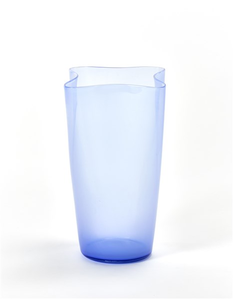 Vase model "9740". Murano, 1954ca. Clear blue blown glass, tapered body with quadrilobed edge on a circular base. (17x30x16 cm.)