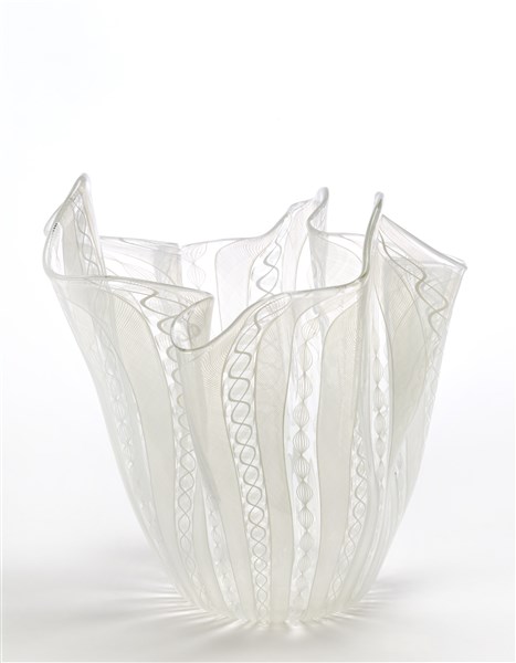 Vaso "fazzoletto" in vetro soffiato trasparente a canne di zanfirico lattimo. Venini, Murano, 1979. Firmato a punta "Venini italia 79". (h cm 28)