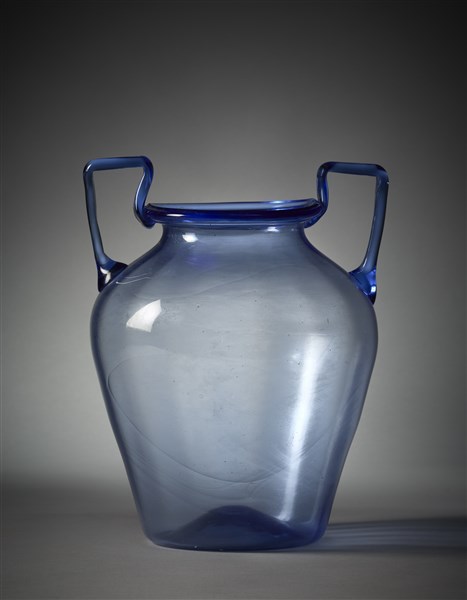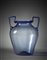 Vaso biansato in vetro soffiato azzurrino trasparente. Anse ad andamento squadrato. Murano, anni '20/'30. (h cm 24,5) (difetti)