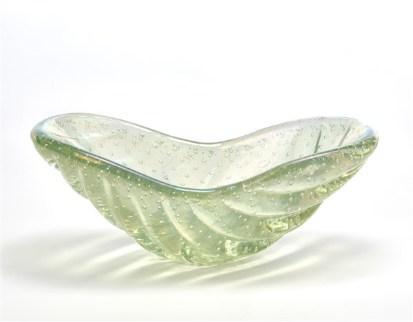 Coppa centrotavola di forma compatibile con il disegno di fornace 8857A in vetro soffiato costolato trasparente incolore con inclusione di bolle e superficie fortemente iridata. Murano, 1951ca. (cm 30x11x14,5) (lievi difetti)
