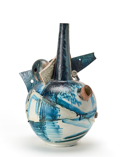 Lotto 562 | Elio Schiavon Vaso scultura in ceramica smaltata in bianco, blu, marrone e nero.
