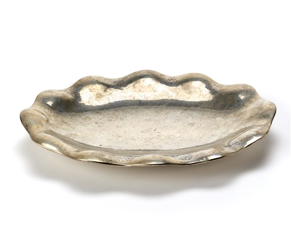 Centerpiece in poded silver with wavy edge on a serpentine base. Milan, 1930s. Engraved marked "GENAZZI" and with the graphic symbol of the manufacture. Punch with title 800. (g 600 circa) (cm 36x28)