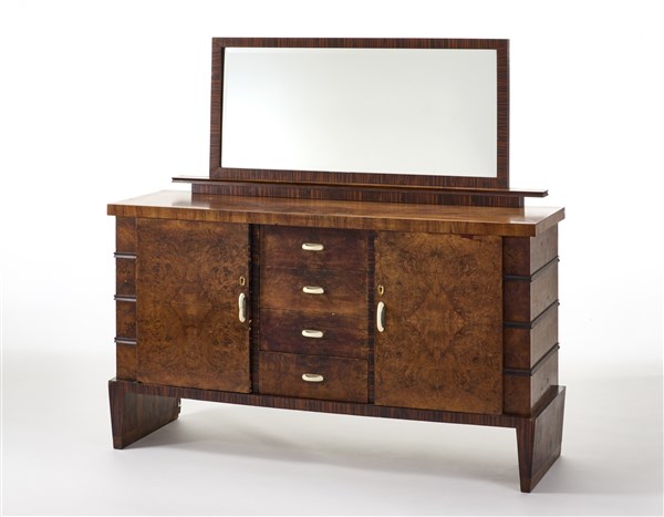 Novecento sideboard with bench base, body with two side doors and four central drawers and sides with horizontal slats. Raised mirror. Solid wood, veneered and edged in briar, mahogany and macassar. Non-original bakelite and brass handles. Milan, 1930ca. (166.5x164x51 cm.) (defects)
