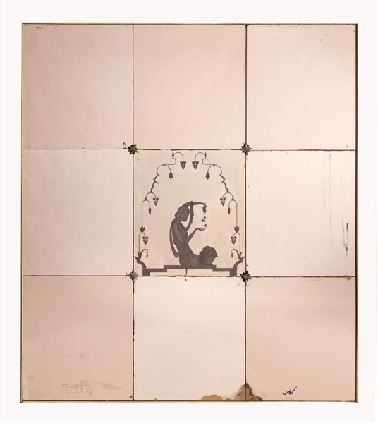 Large mirror. Milan, 1931. Nine mirrors in rosambé glass, of which the central one is sand-jet decorated, brass rosettes and frame, wooden frame. Marked and dated 30.3.1931 on the back. (164.5x180 cm.) (slight defects)