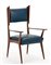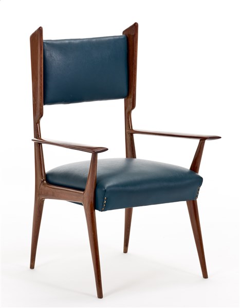 Poltrona in legno di mogano massello con seduta e schienale in vinilpelle verde. Italia, anni '70. (cm 65x108x56) (lievi difetti)