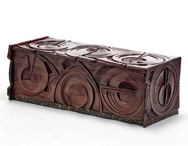 Gianni Pinna Cassettone in legno massello decorato a intaglio con motivi circola