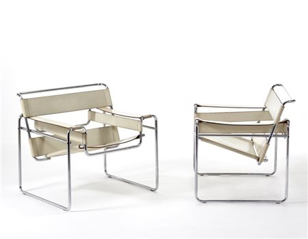 Pair of armchairs model "B3" o "Wassily". Produced by Gavina, San Lazzaro Di Savena, 1960s/1970s. Chromed steel tube and white leather. (78x74x65 cm.) (slight defects)
