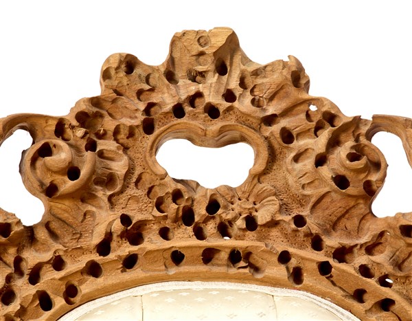 Poltrona "Omaggio a Casanova". Italia, inizio anni '70. Legno di faggio "tarlato" a trapano, tessuto imbottito. Firmata. (cm 90x115x90) (difetti)