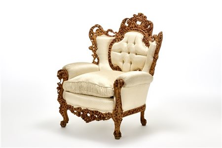 Armchair "Homage to Casanova". Italy. Drilled "worm-eaten" beech wood, padded fabric. Signed. (90x115x90 cm.) (defects)