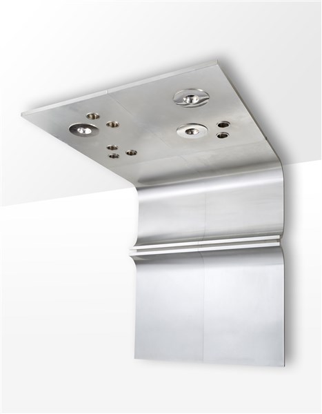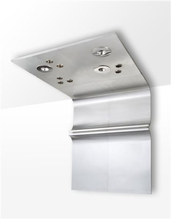 Pannello da parete e soffitto con illuminazione integrata unito a cinque mensole. Pavia, anni '70. Legno rivestito di lamina di alluminio. Esemplare unico. (cm 188x227x225) (lievi difetti)